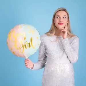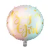 Balon din folie lucioasă Boy or Girl, mix de culori cu imprimeu metalic auriu, diametru înainte de umflare aproximativ 45 cm (18”), diametru după umflare aproximativ 35 cm (14”). Se umflă cu heliu și aer.