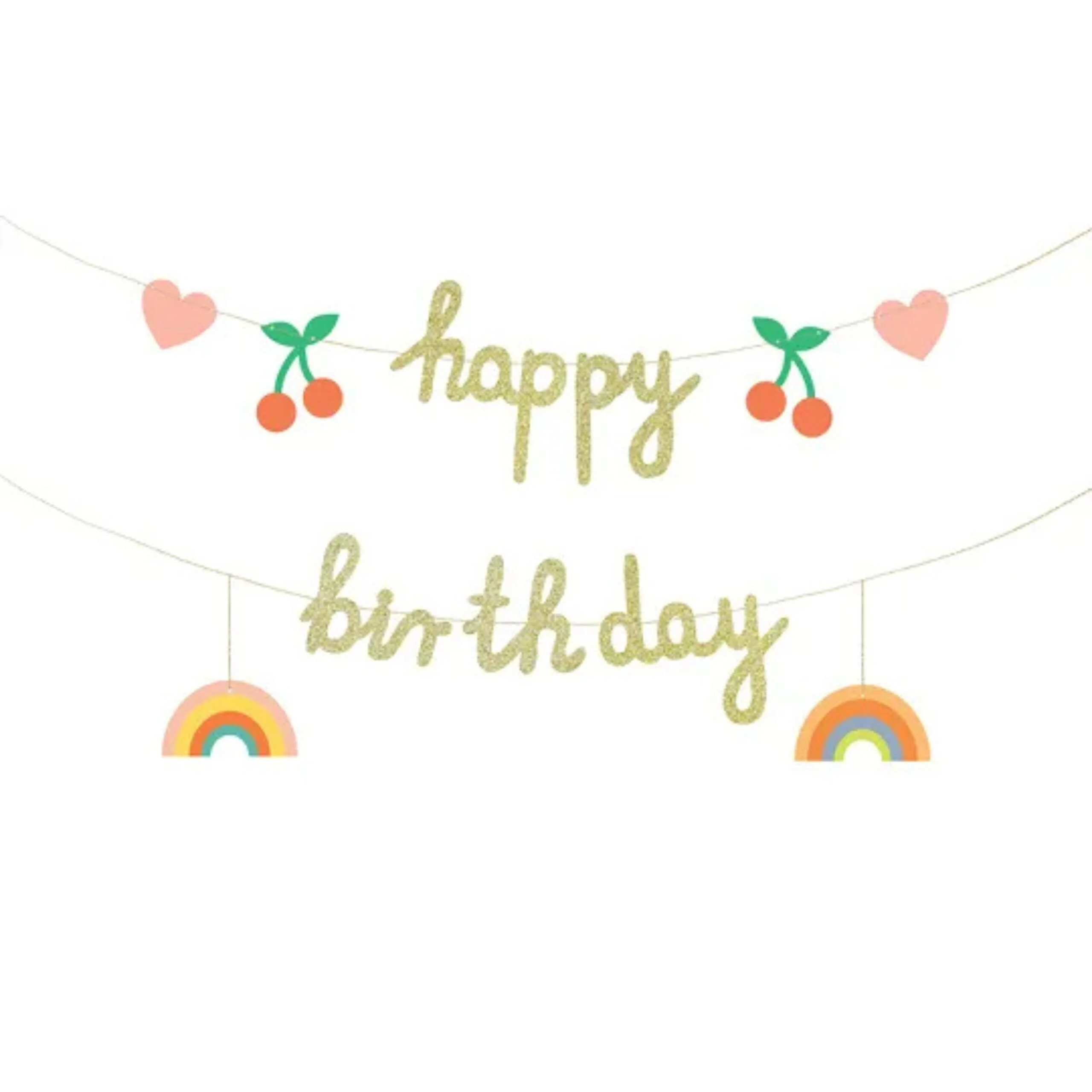 Adaugă un plus de culoare și veselie petrecerii cu această ghirlandă „Happy Birthday”, decorată cu cireșe și curcubeie delicate. Cu o lungime totală de 100 cm și litere din fetru în nuanțe pastel, este ideală pentru aniversări tematice, decoruri pentru copii sau candy bar.