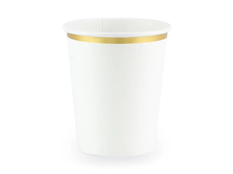 Pahare de hârtie, albe cu margini aurii, capacitate de până la 260 ml.